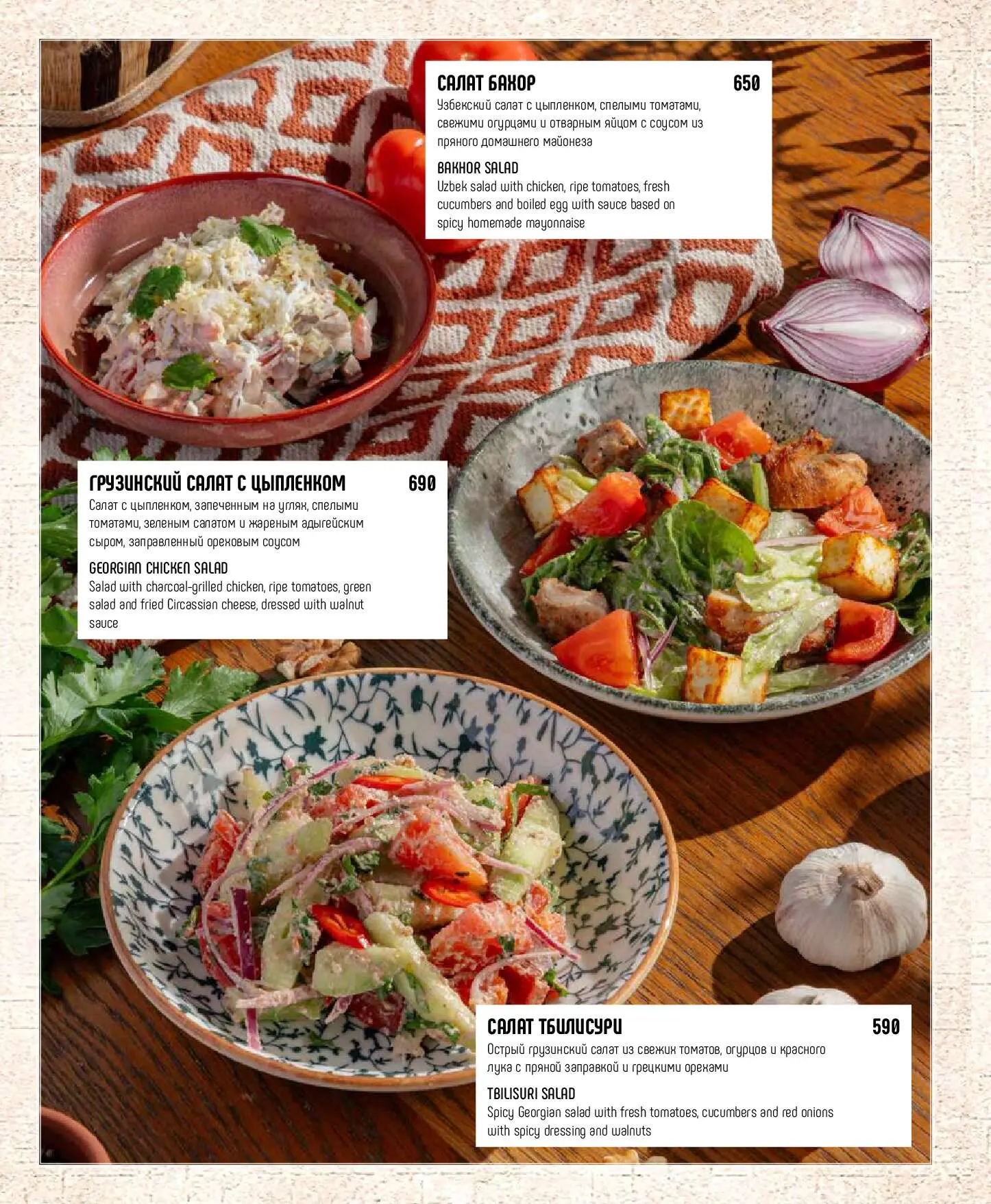 Салат ТбилисуриОстрый грузинский салат из свежих томатов, огурцов и красного лука с пряной заправкой и грецкими орехами590 руб.