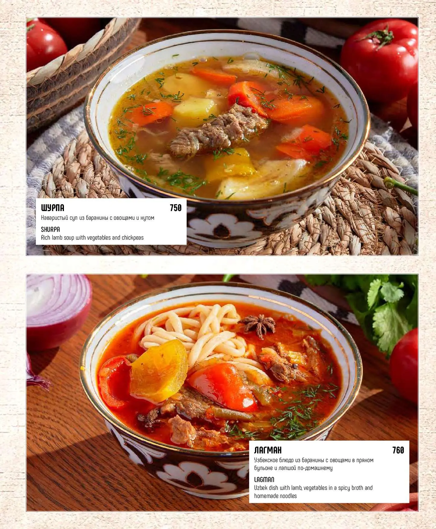 ЛагманУзбекское блюдо из баранины с овощами в пряном бульоне и лапшой по-домашнему760 руб.