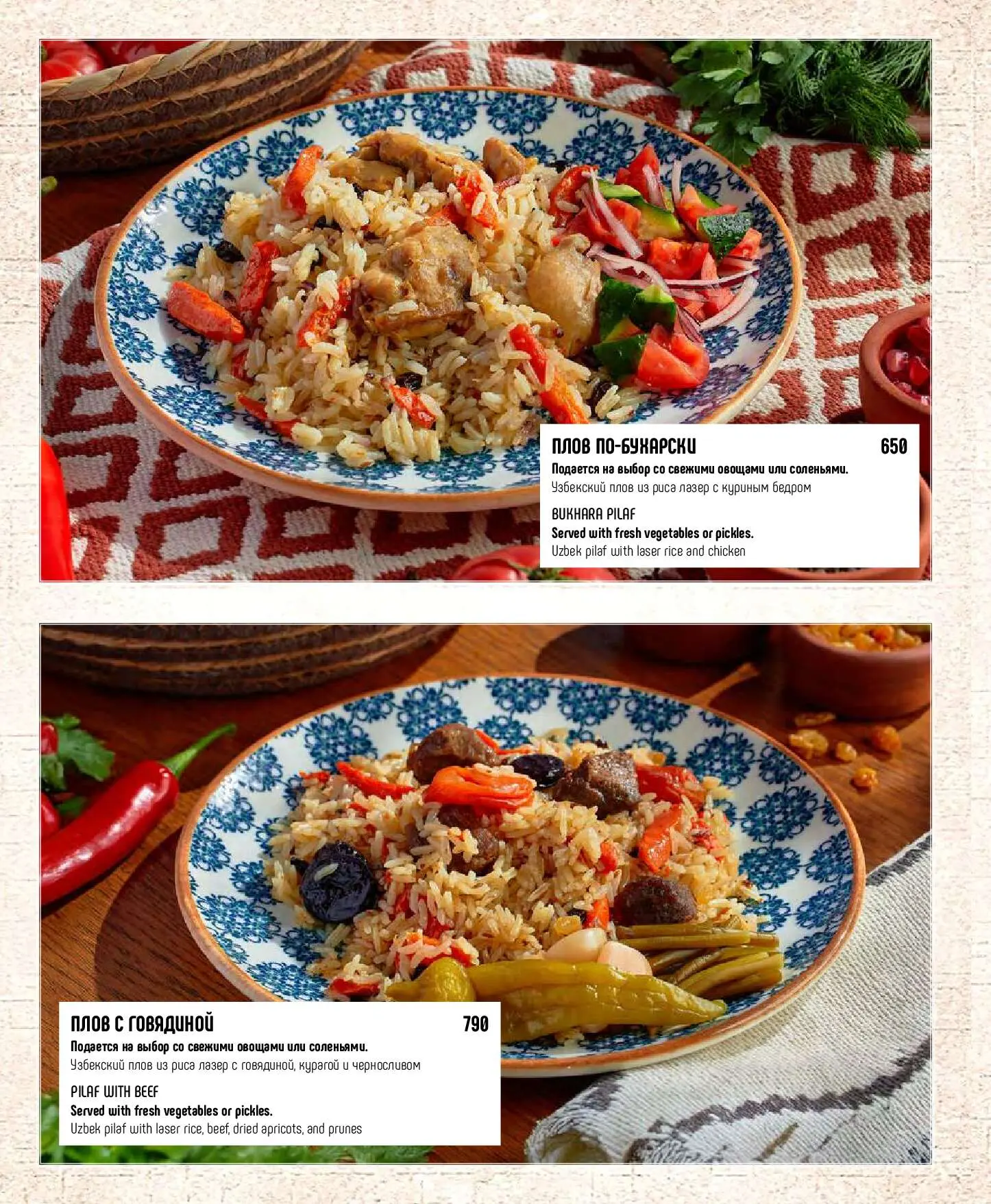 ПловПодается на выбор со свежими овощами или соленьями. Праздничный узбекский плов из риса девзира с бараниной, нутом и барбарисом890 руб.