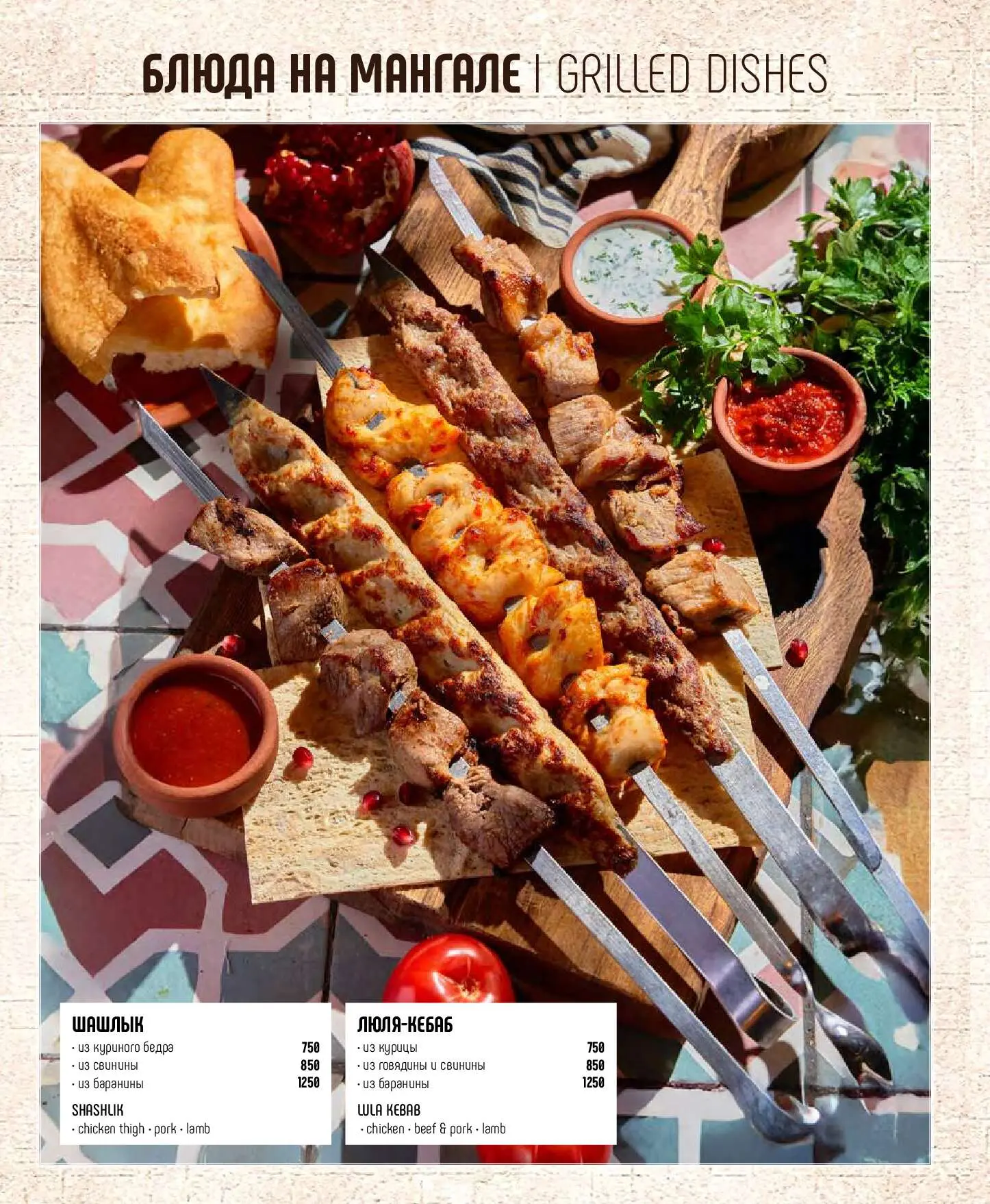 Большой грузинский завтракЛюля-кебаб из курицы, яичница глазунья, салат овощной, лобио, лепешка, соус сацебели750 руб.