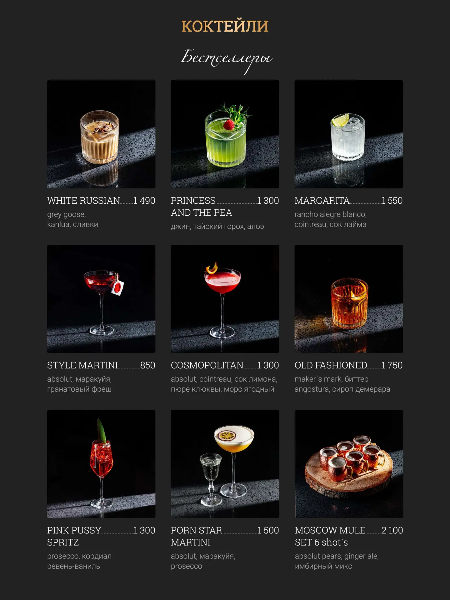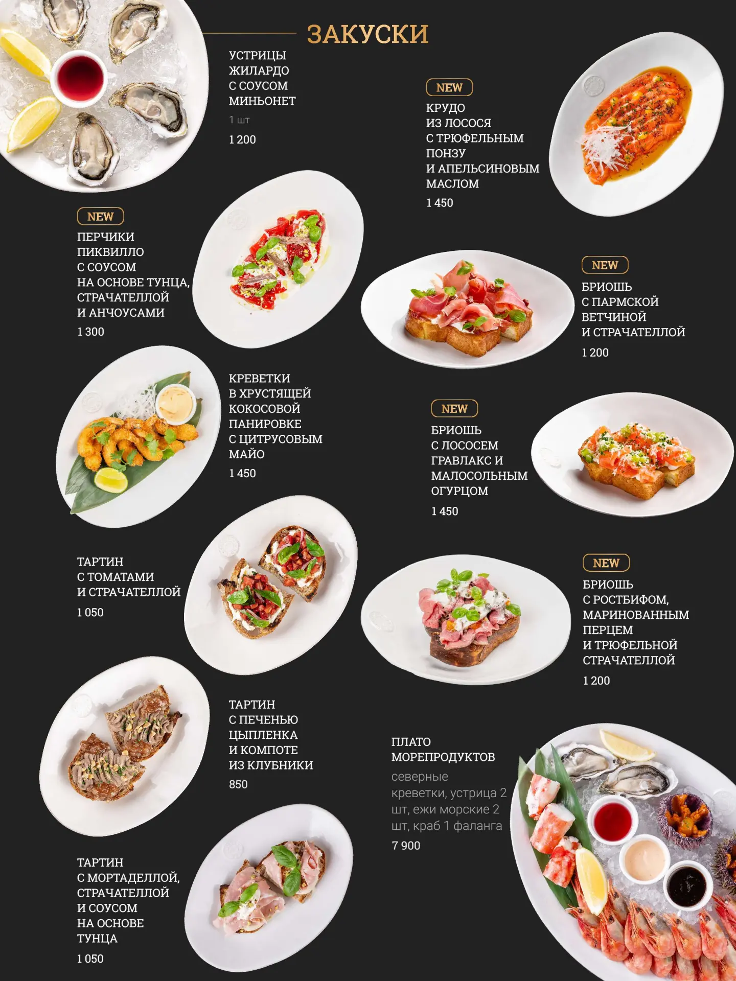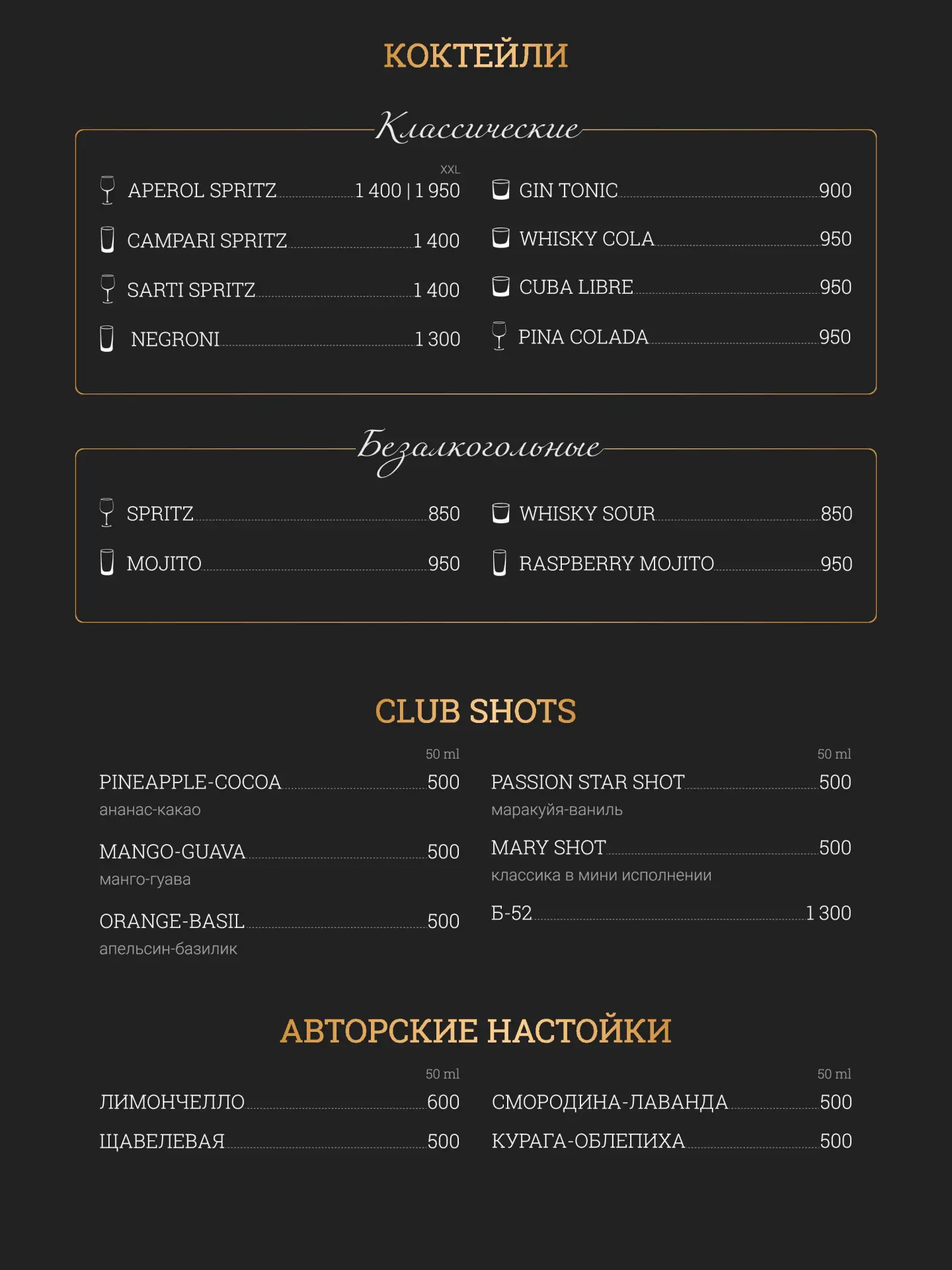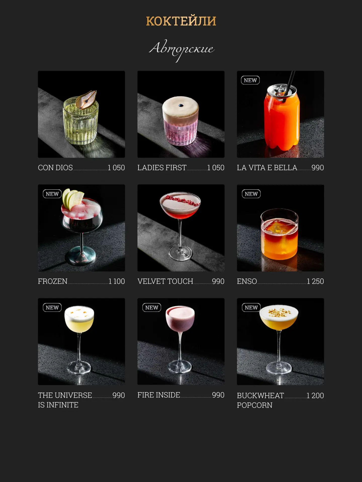 Кухонное меню заведения создано в сотрудничестве с известным итальянским шеф-поваром и ресторатором Антонио Фреза. Кроме того, здесь представлена эксклюзивная барная карта, в которой собраны уникальные авторские коктейли. Коллекция насчитывает более двухсот видов напитков со всего мира, включая как классические, так и премиальные варианты.
