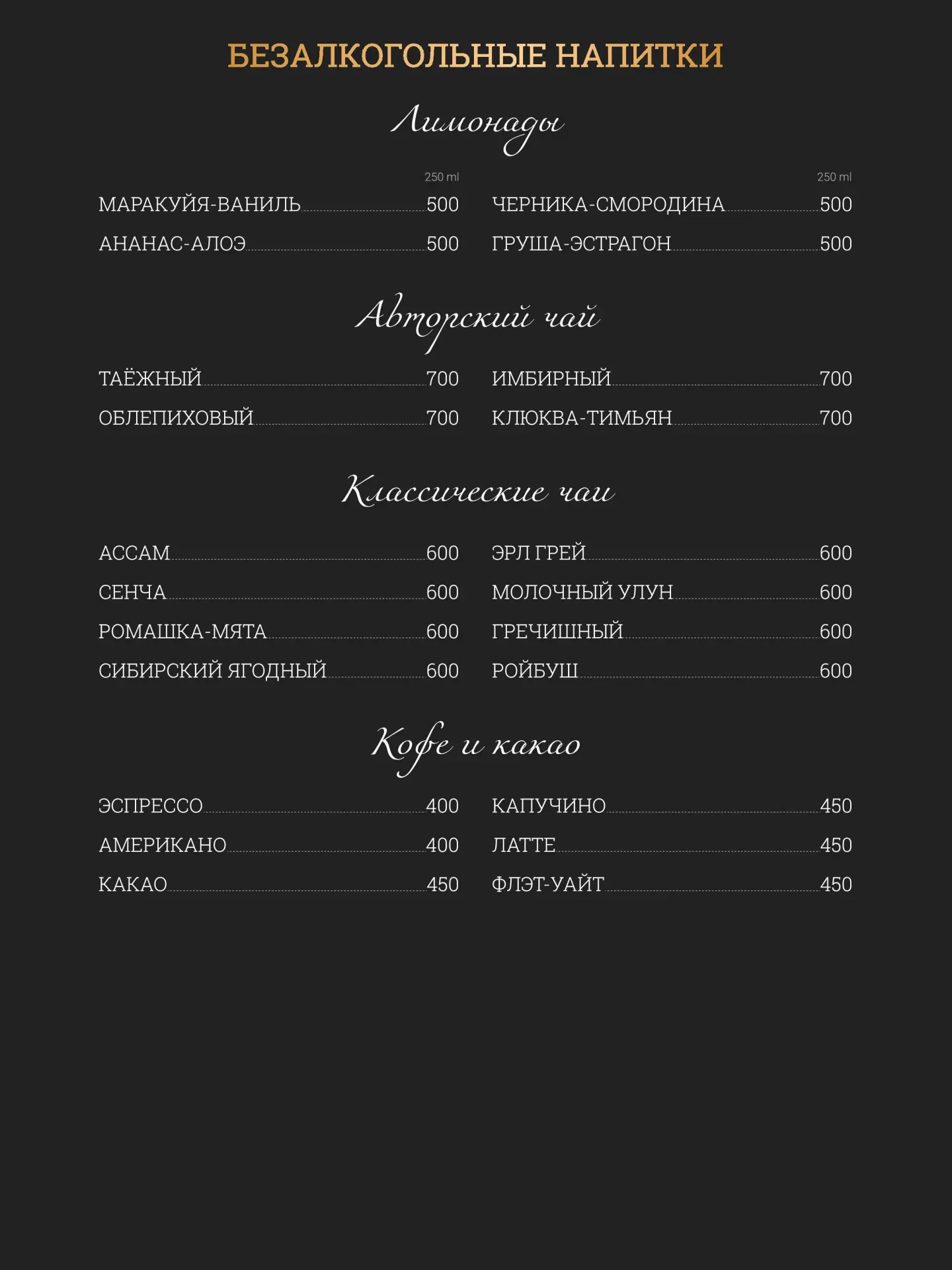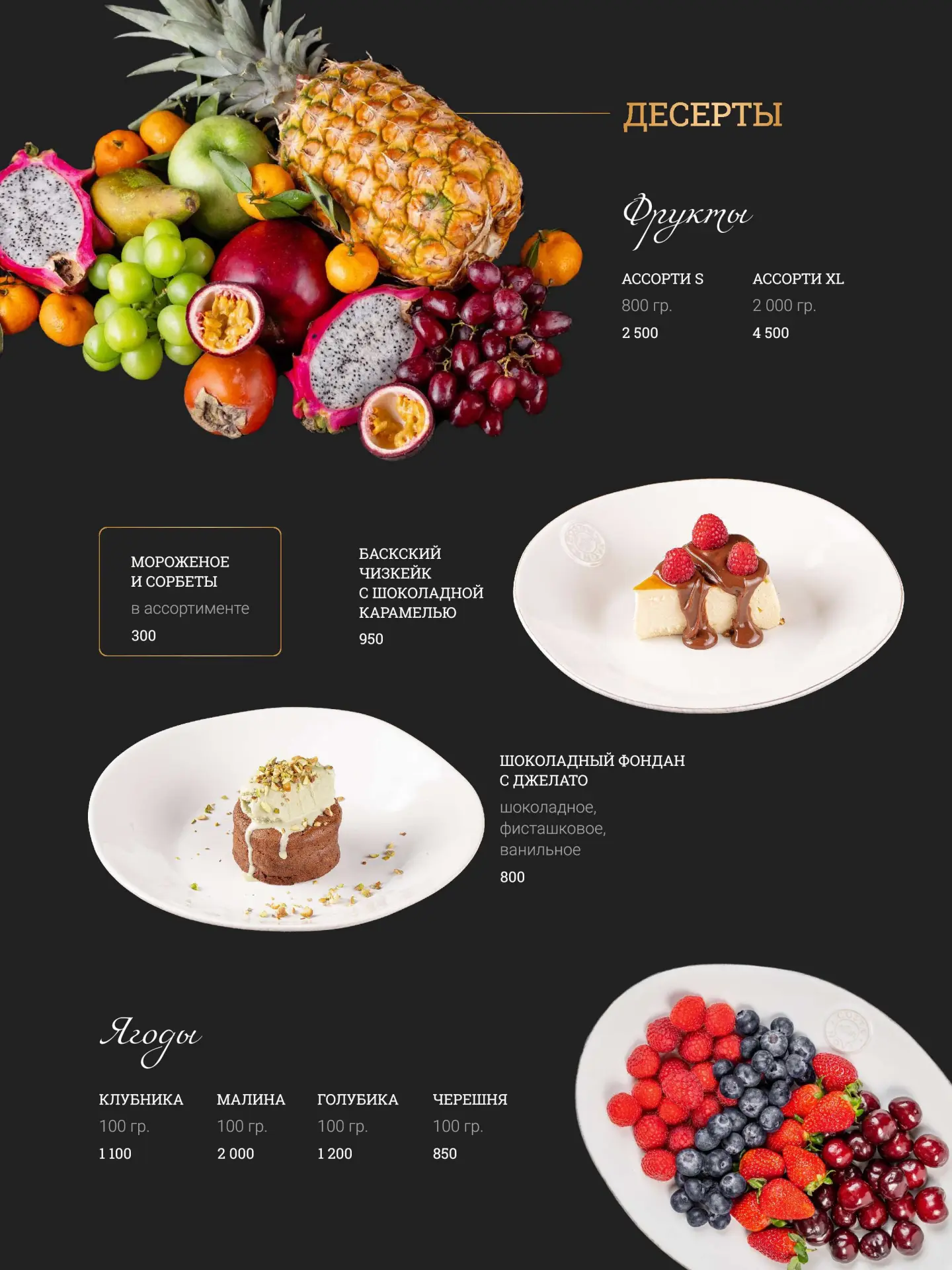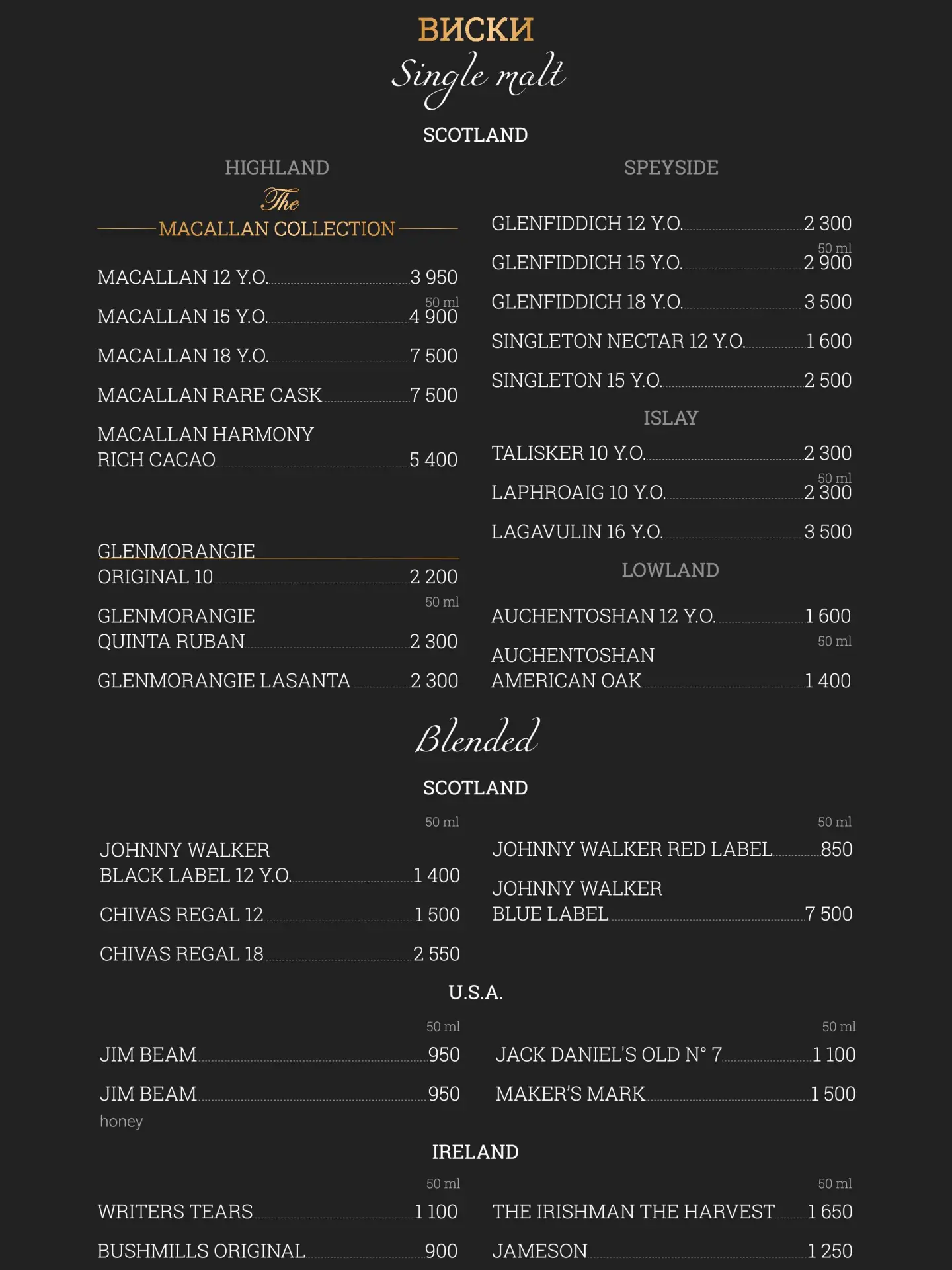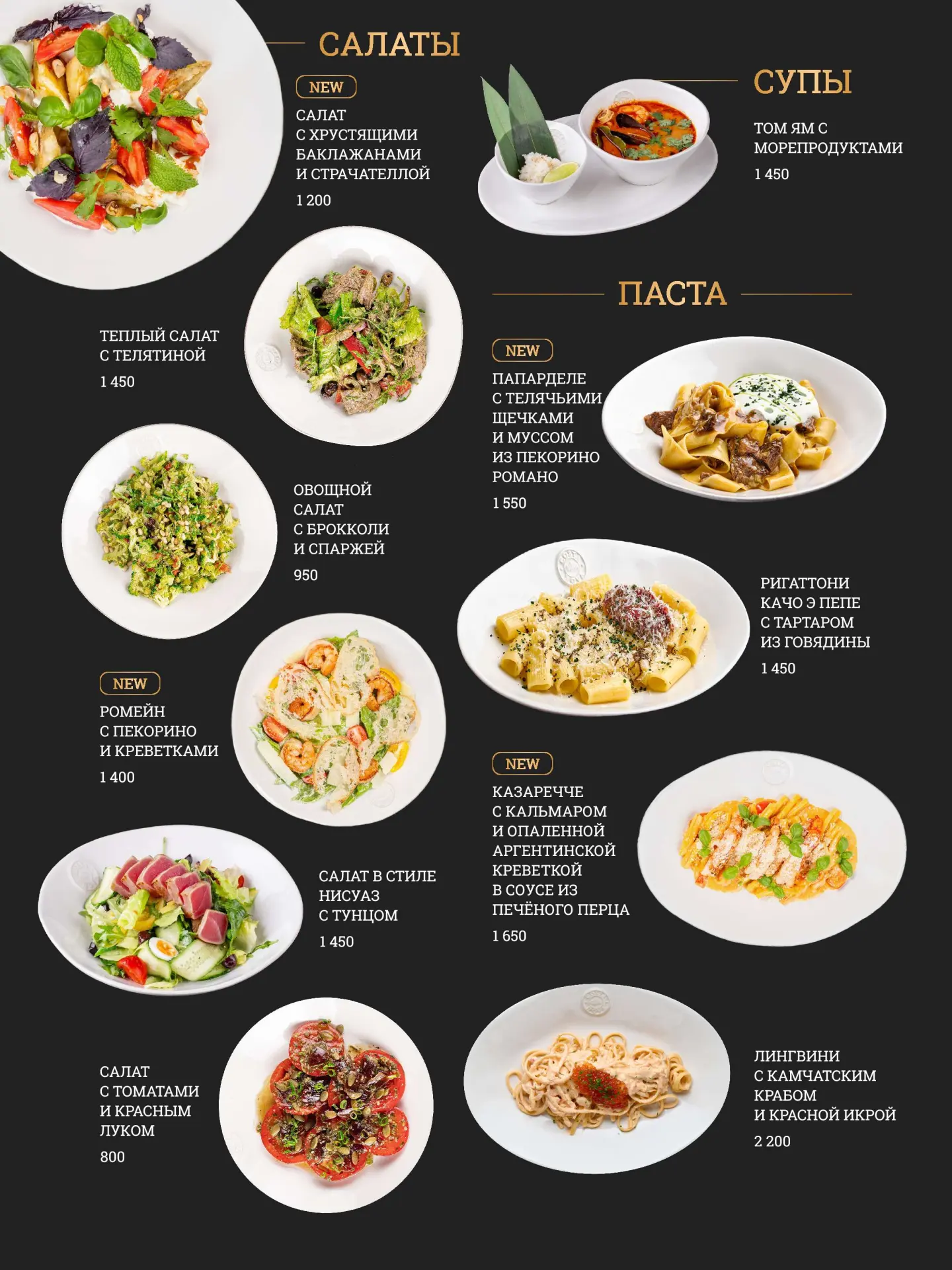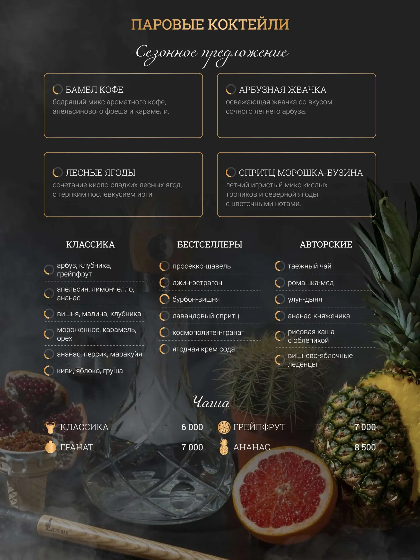 Кухонное меню заведения создано в сотрудничестве с известным итальянским шеф-поваром и ресторатором Антонио Фреза. Кроме того, здесь представлена эксклюзивная барная карта, в которой собраны уникальные авторские коктейли. Коллекция насчитывает более двухсот видов напитков со всего мира, включая как классические, так и премиальные варианты.