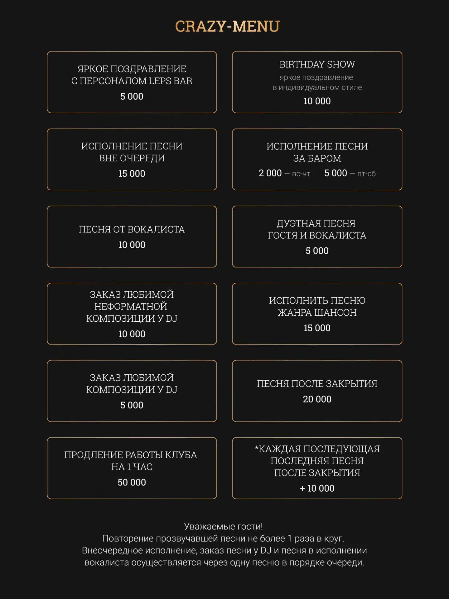По словам представителей «Лепс Бар», уникальность заведения заключается в сочетании трех форматов: караоке-бар — место, где хочется петь свои любимые песни; коктейль-бар — место встречи ценителей авторских коктейлей и премиальных напитков; клуб — место притяжения ценителей ночной жизни. Это делает Leps Bar привлекательным для любителей караоке, ночных клубов и авторских коктейлей. Для тех, кто хочет провести время в уютной компании или отметить значимое событие в приватной обстановке, предусмотрен VIP-зал.