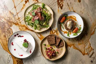 Карпаччо из мраморной говядины с молодым салатом и муссом сулугуни890 руб.