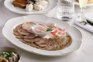 Буженина чинёная чеснокамиподаётся с вершковым хреном и ядрёной горчицей390 руб.