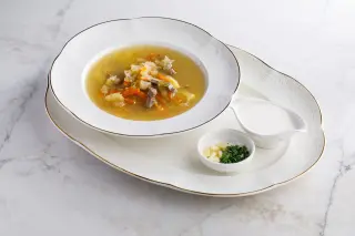 Золотой куриный бульонс перепелиным яйцом, подаётся в чашках, вприхлёбку520 руб.