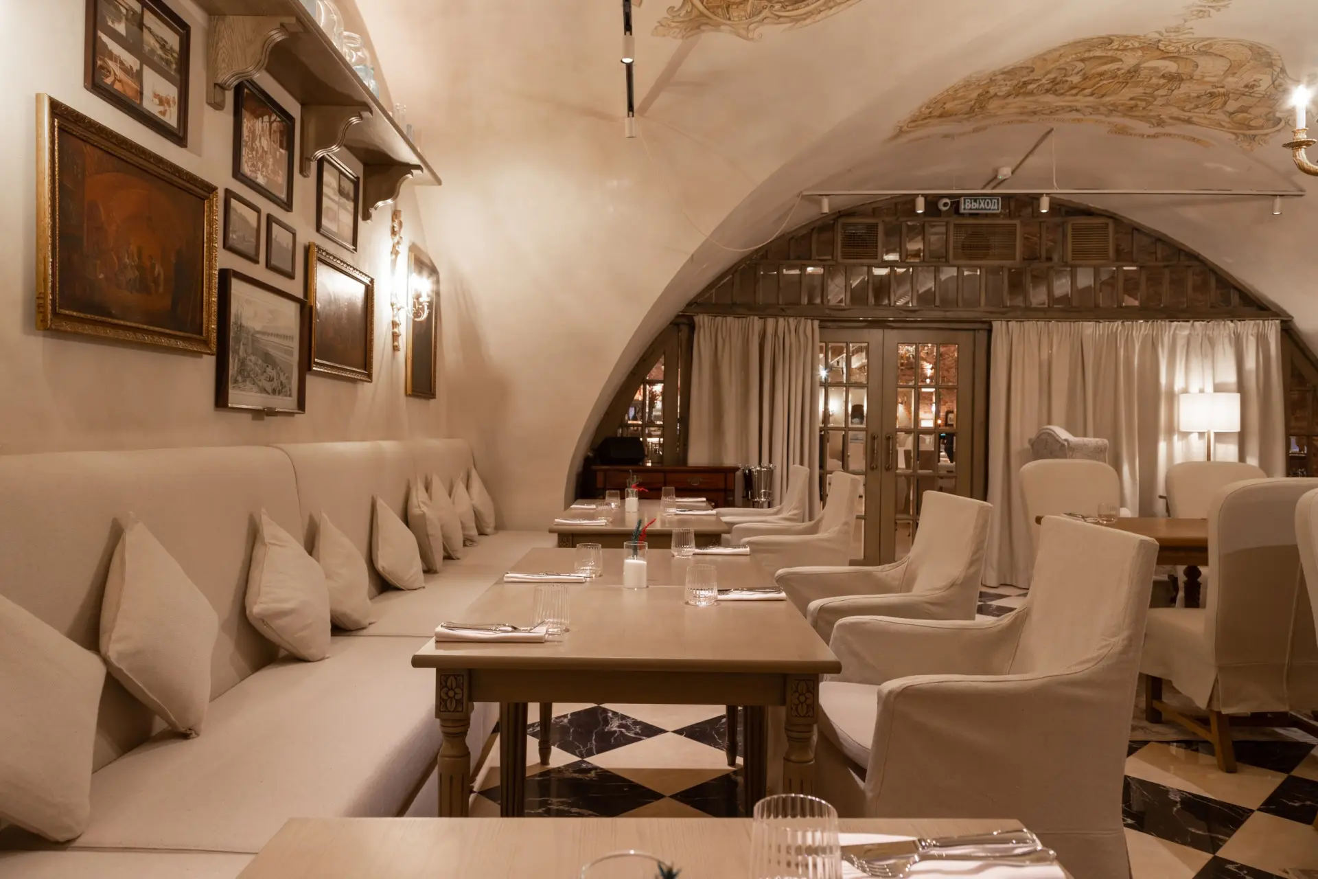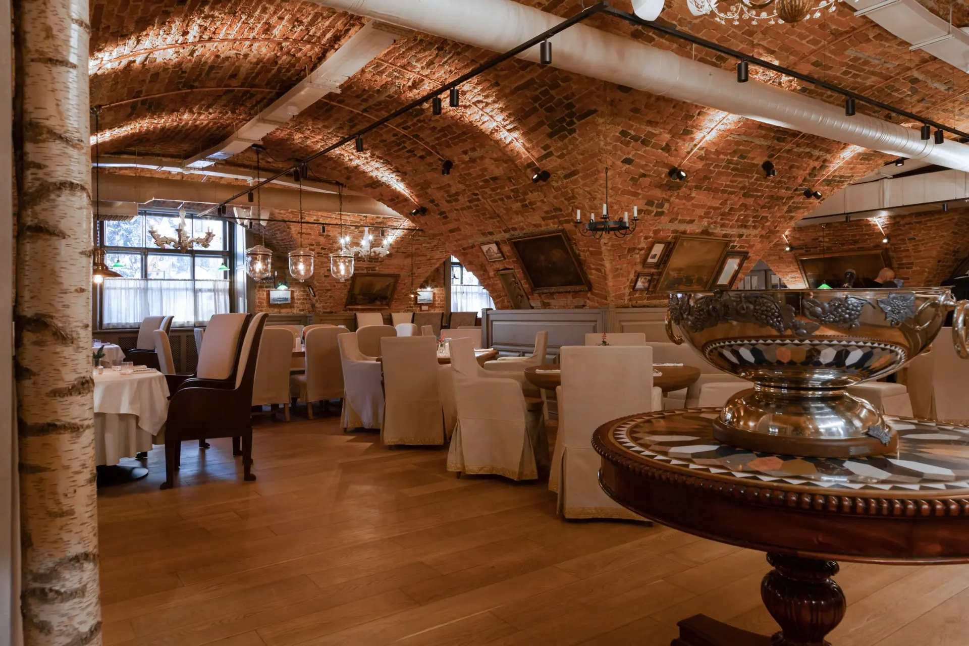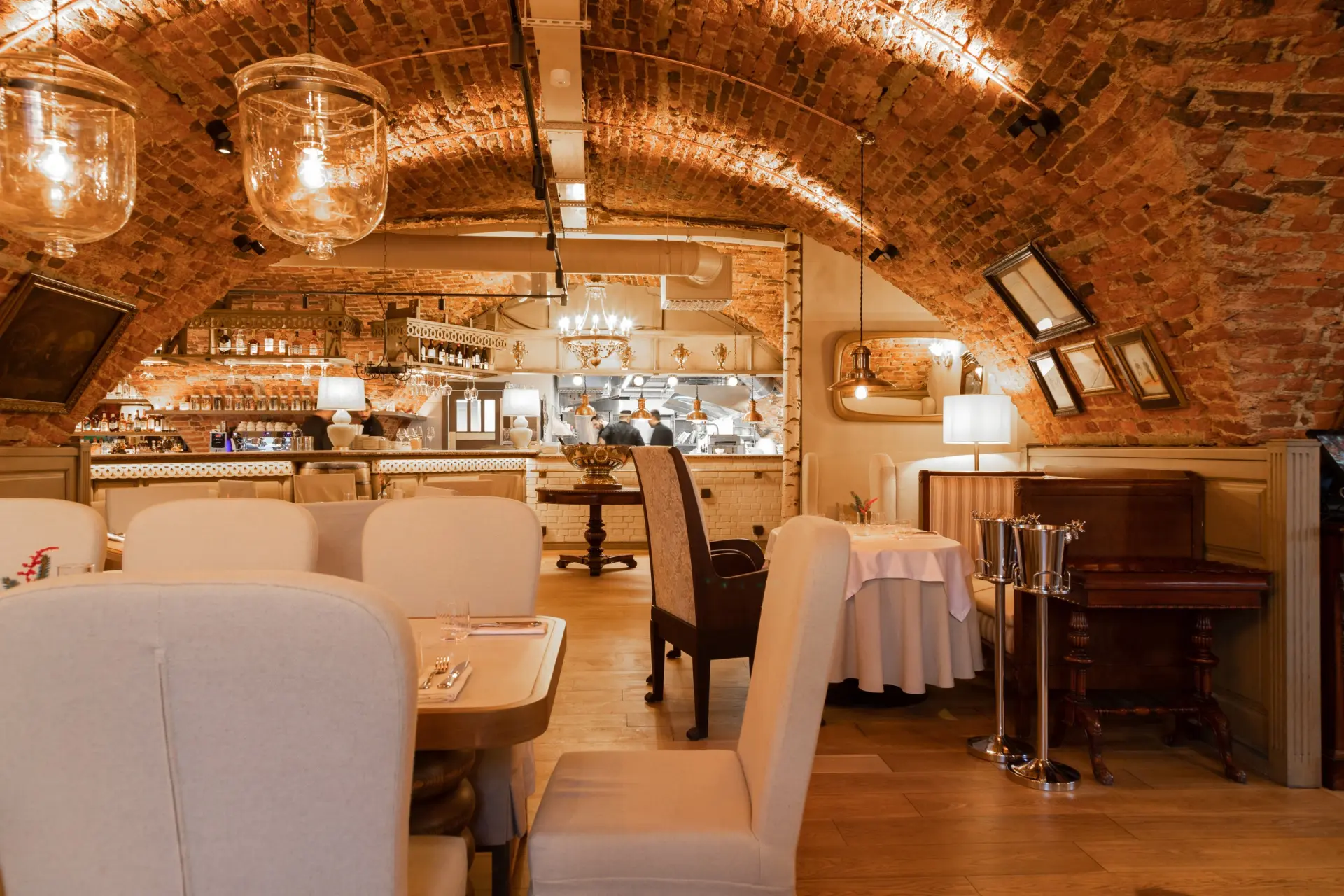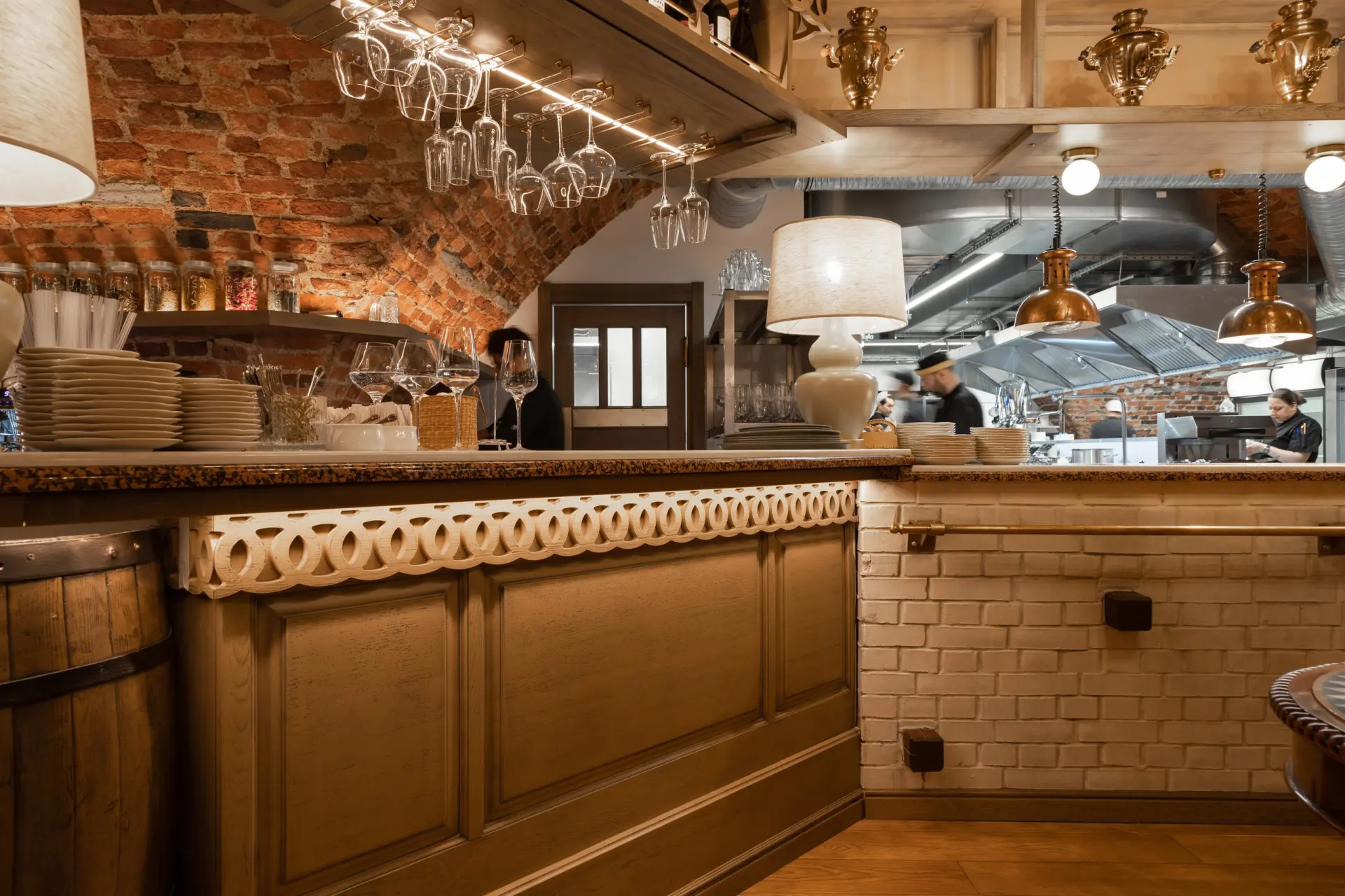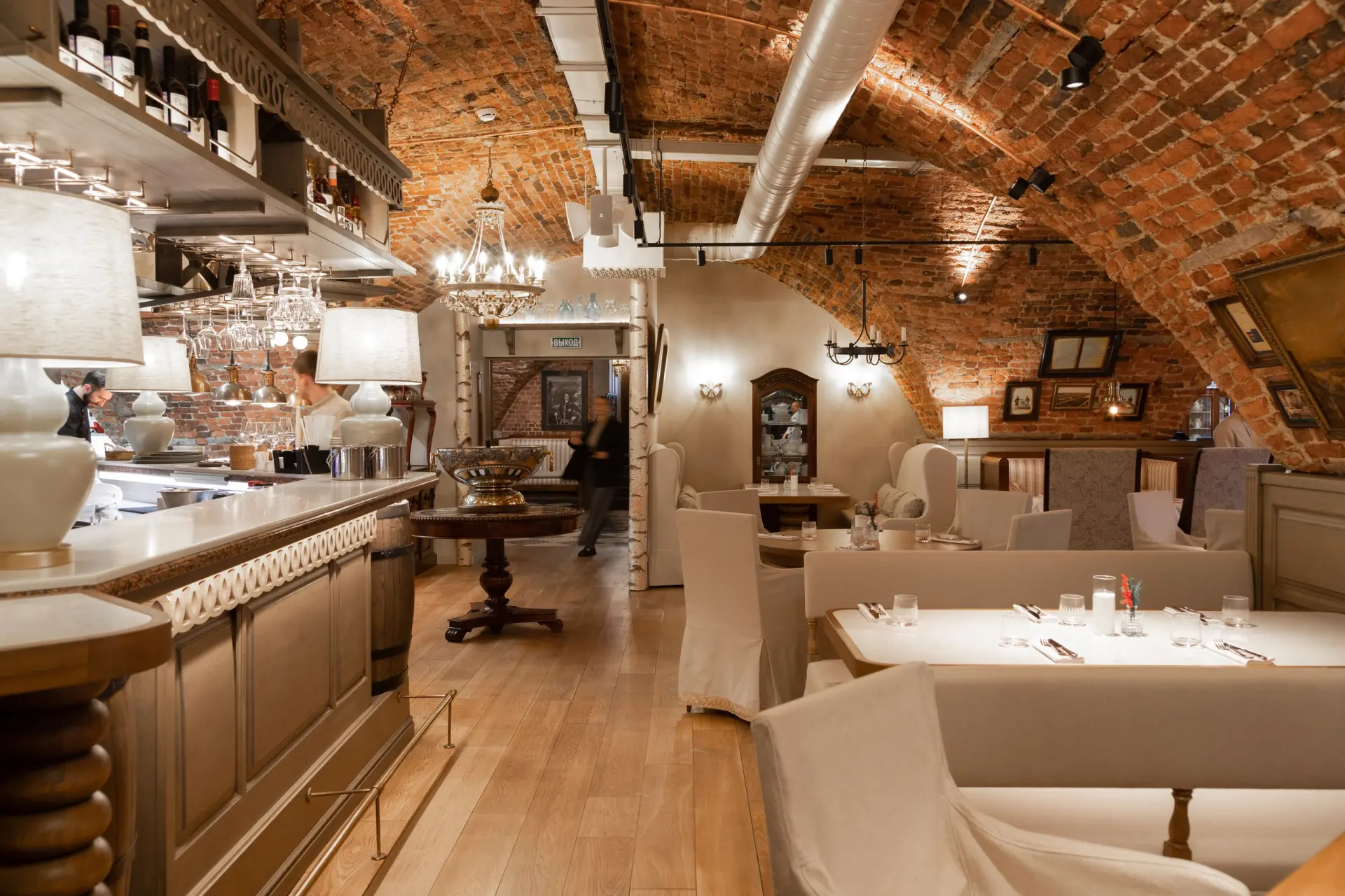 В интерьере сохранился сводчатый потолок и кирпичная кладка, барная стойка оформлена деревом с резными элементами, образ дополняют кованые люстры с лампочками-свечками, классическая сервировка столов.