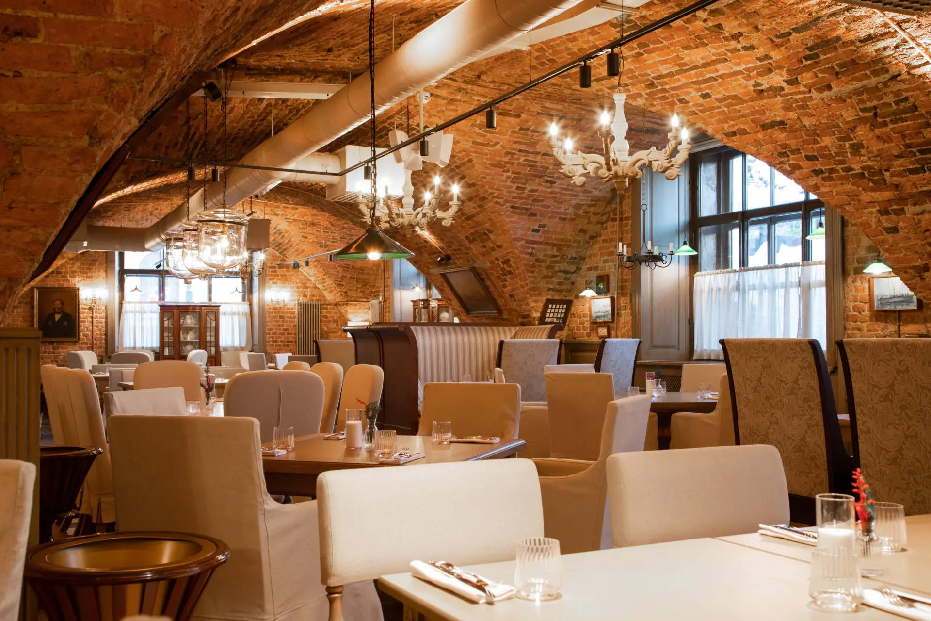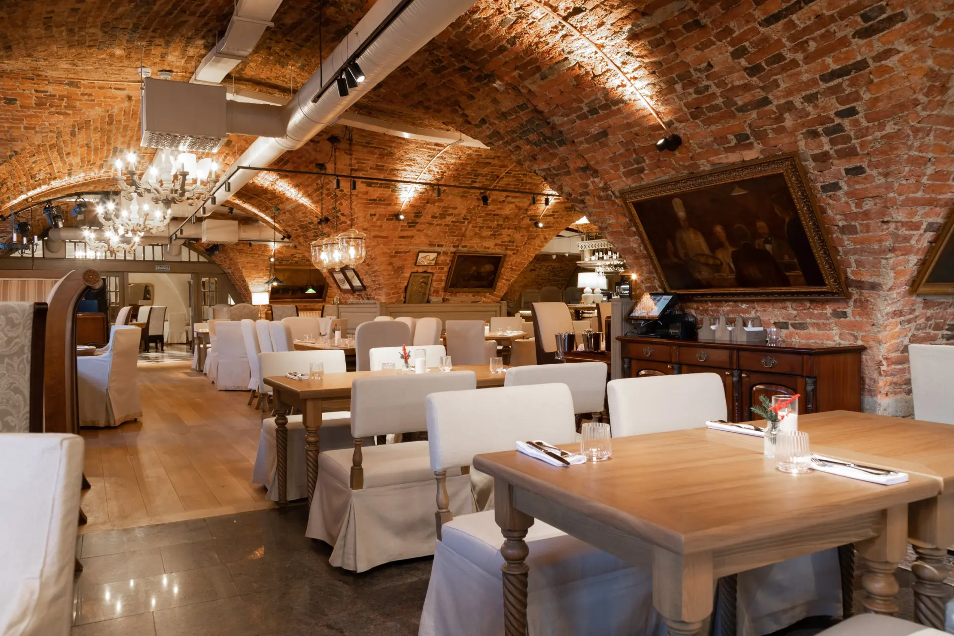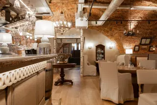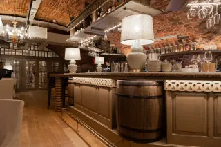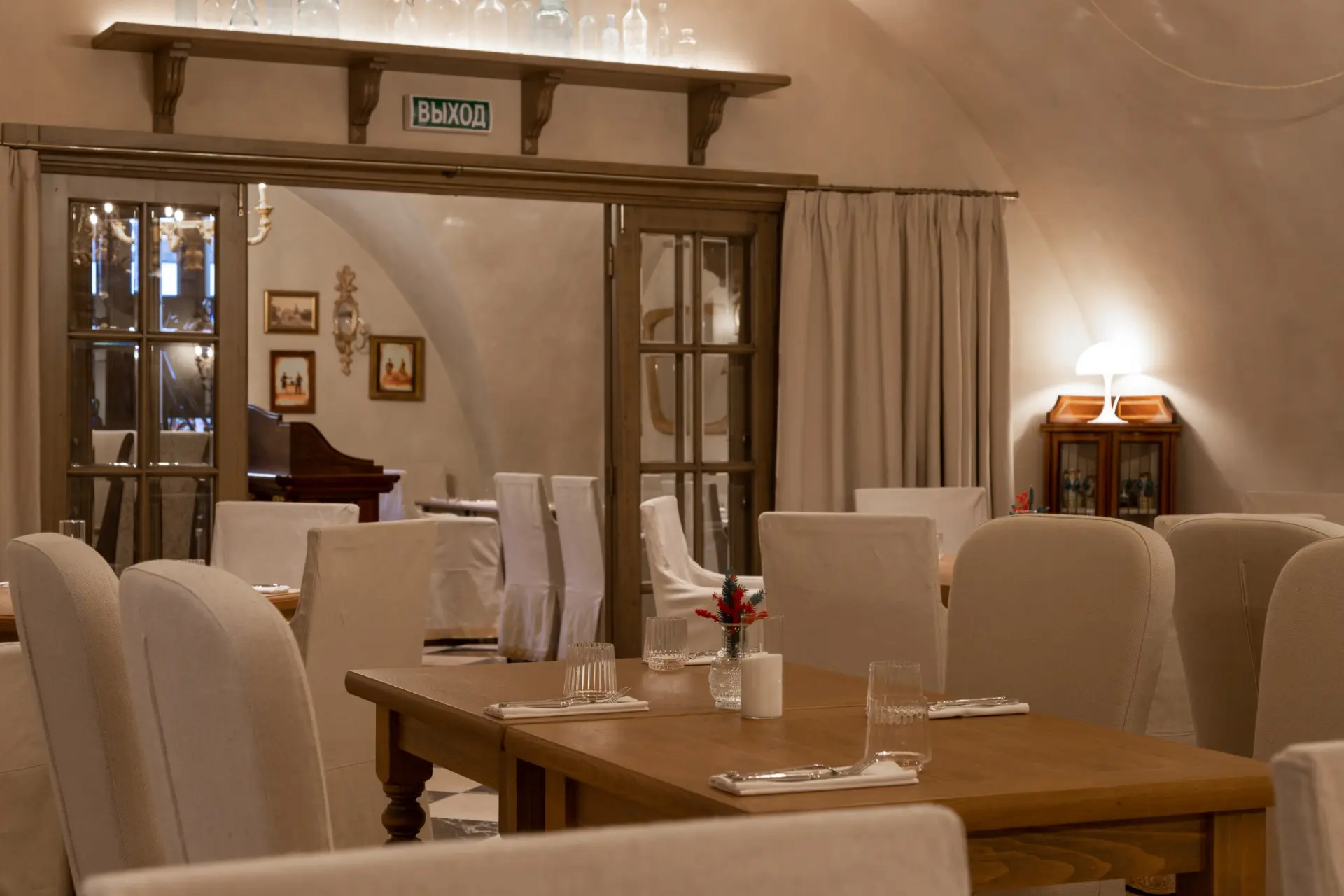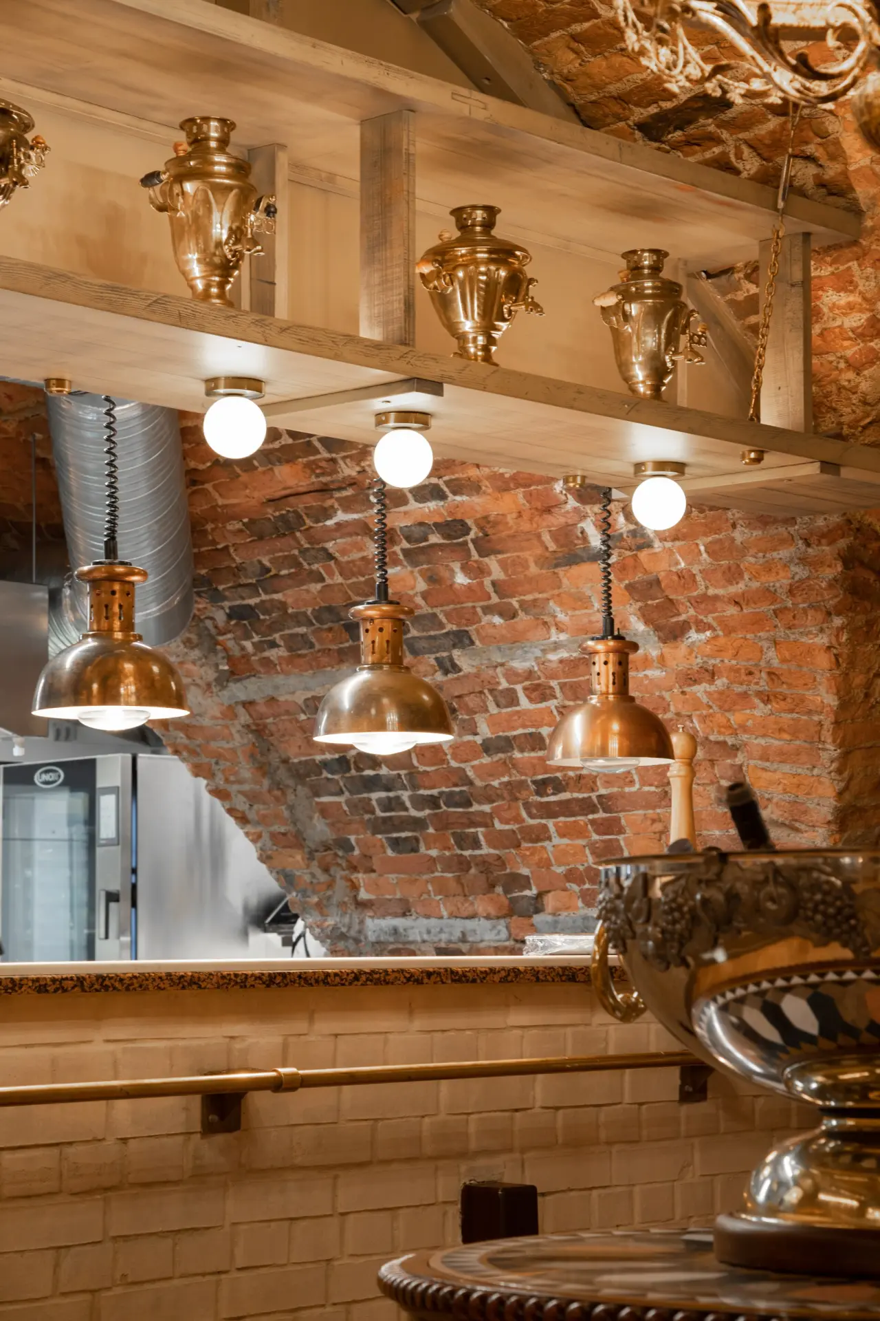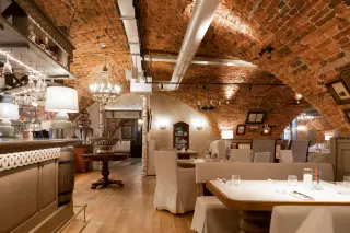 В интерьере сохранился сводчатый потолок и кирпичная кладка, барная стойка оформлена деревом с резными элементами, образ дополняют кованые люстры с лампочками-свечками, классическая сервировка столов.