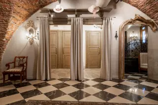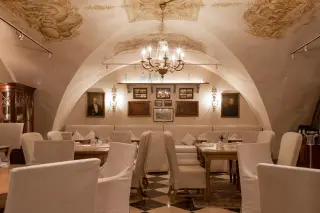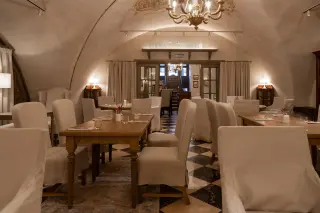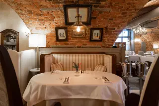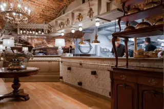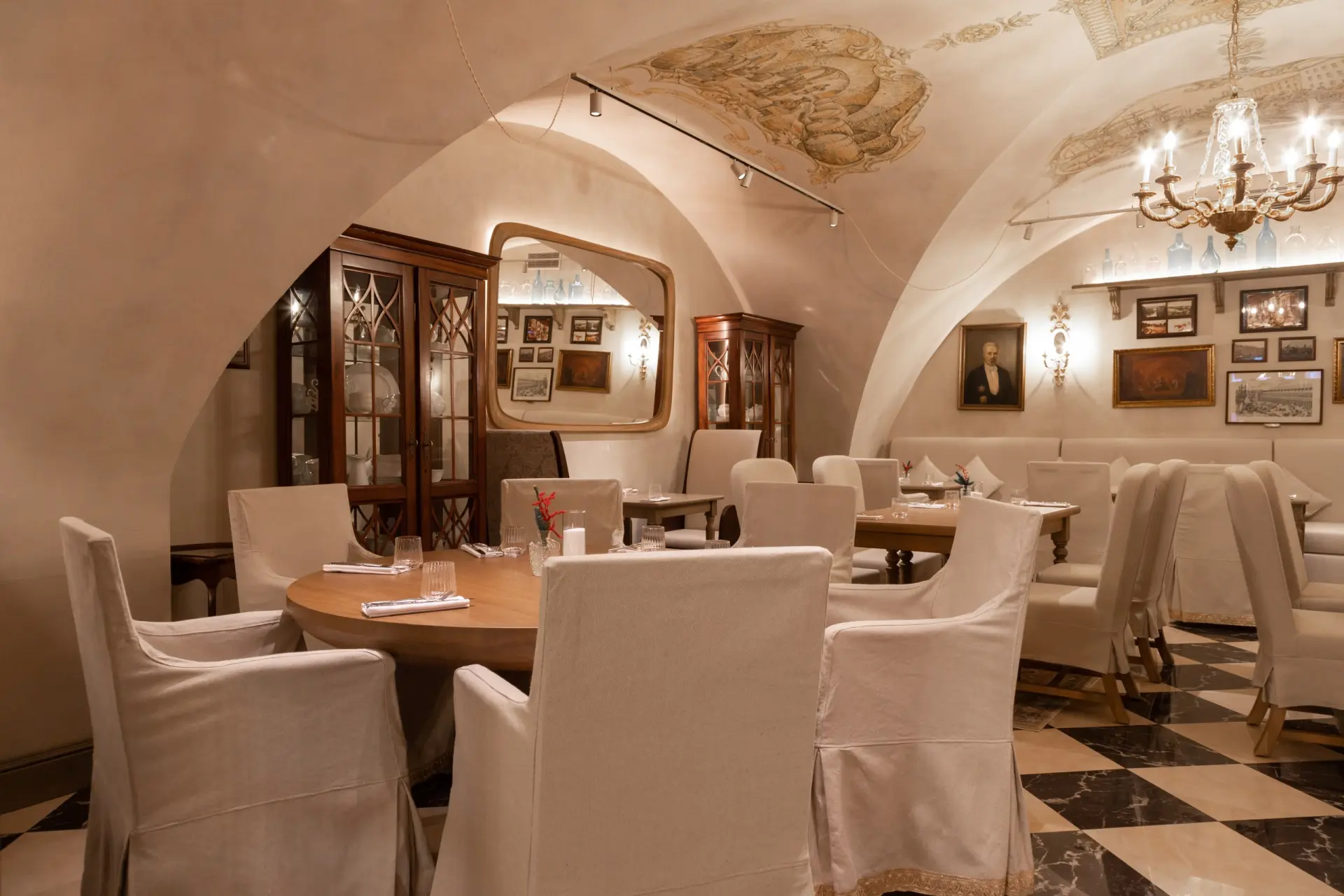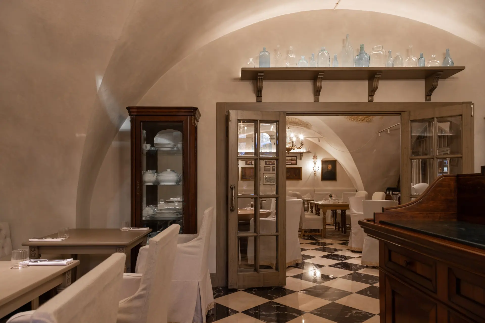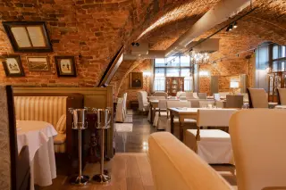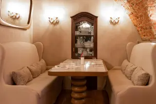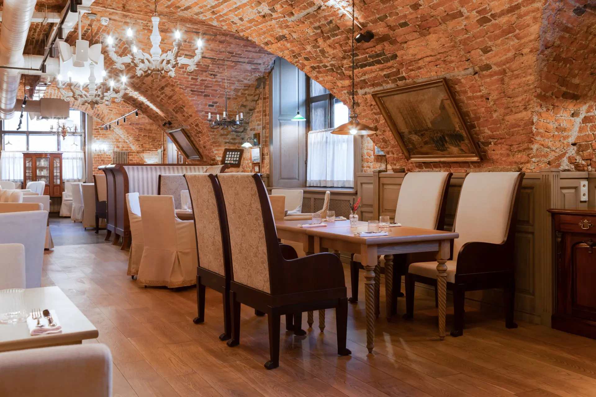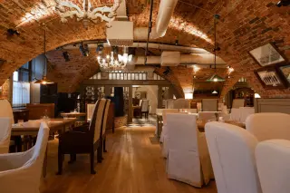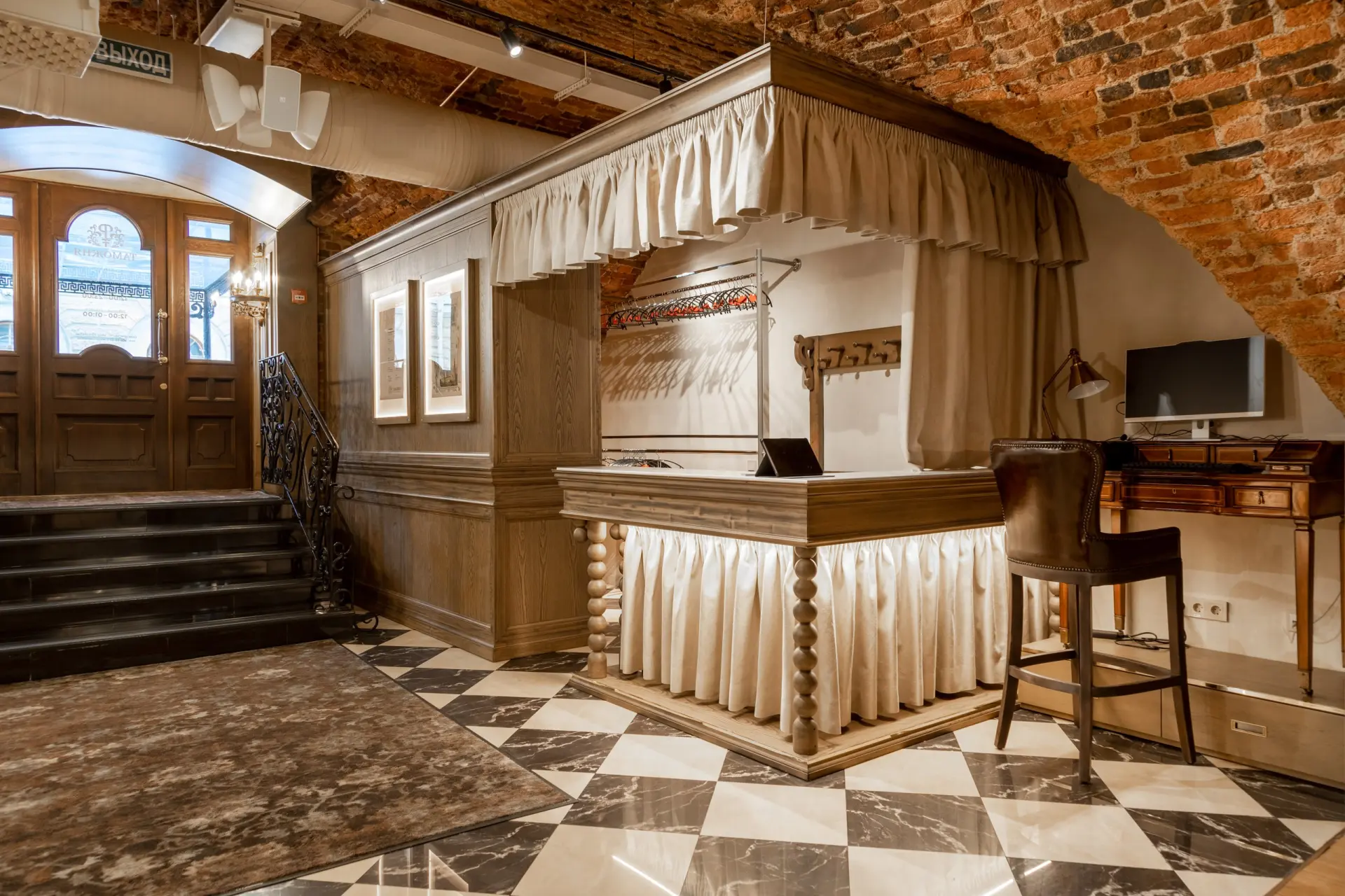 В интерьере сохранился сводчатый потолок и кирпичная кладка, барная стойка оформлена деревом с резными элементами, образ дополняют кованые люстры с лампочками-свечками, классическая сервировка столов.