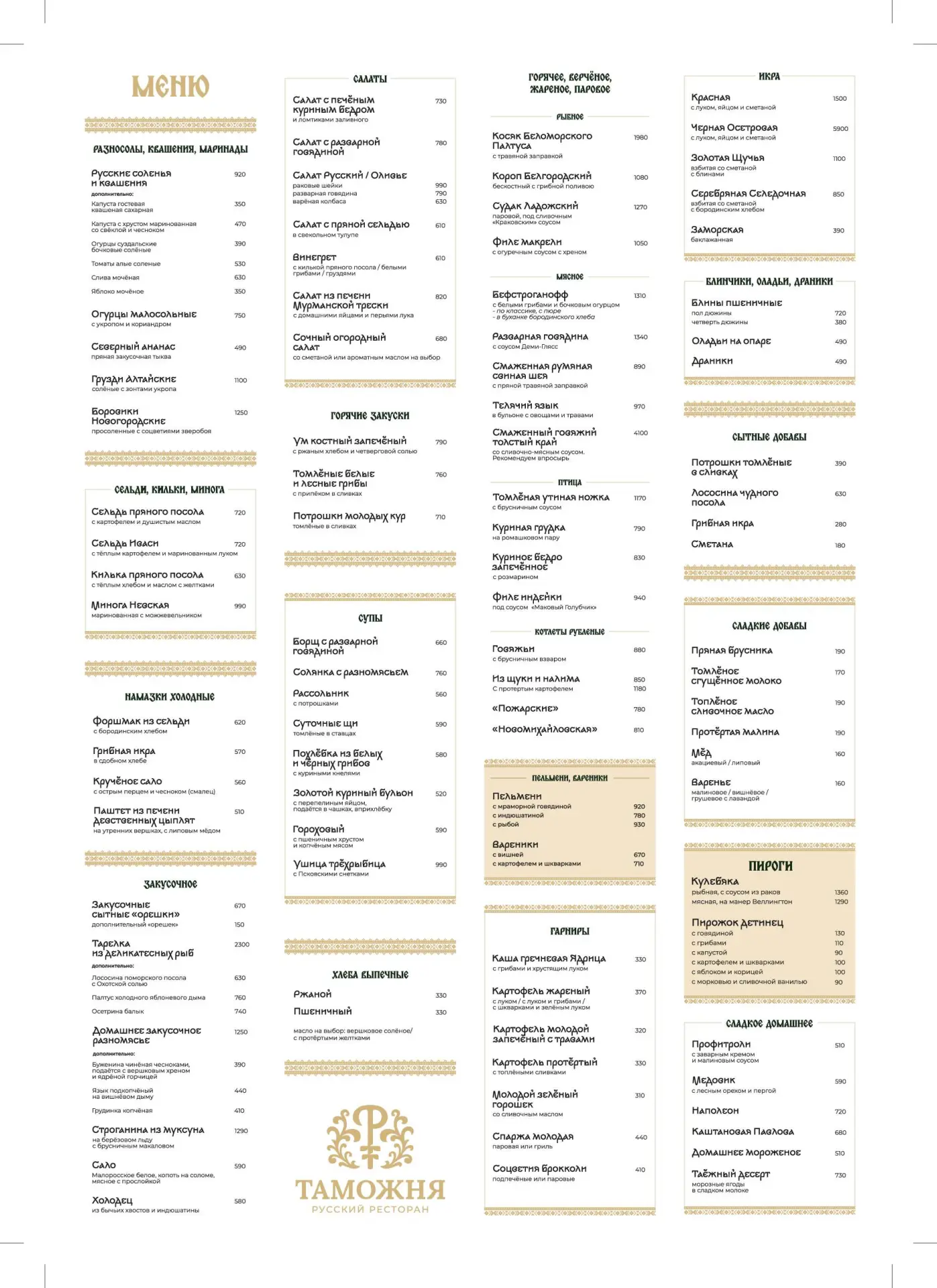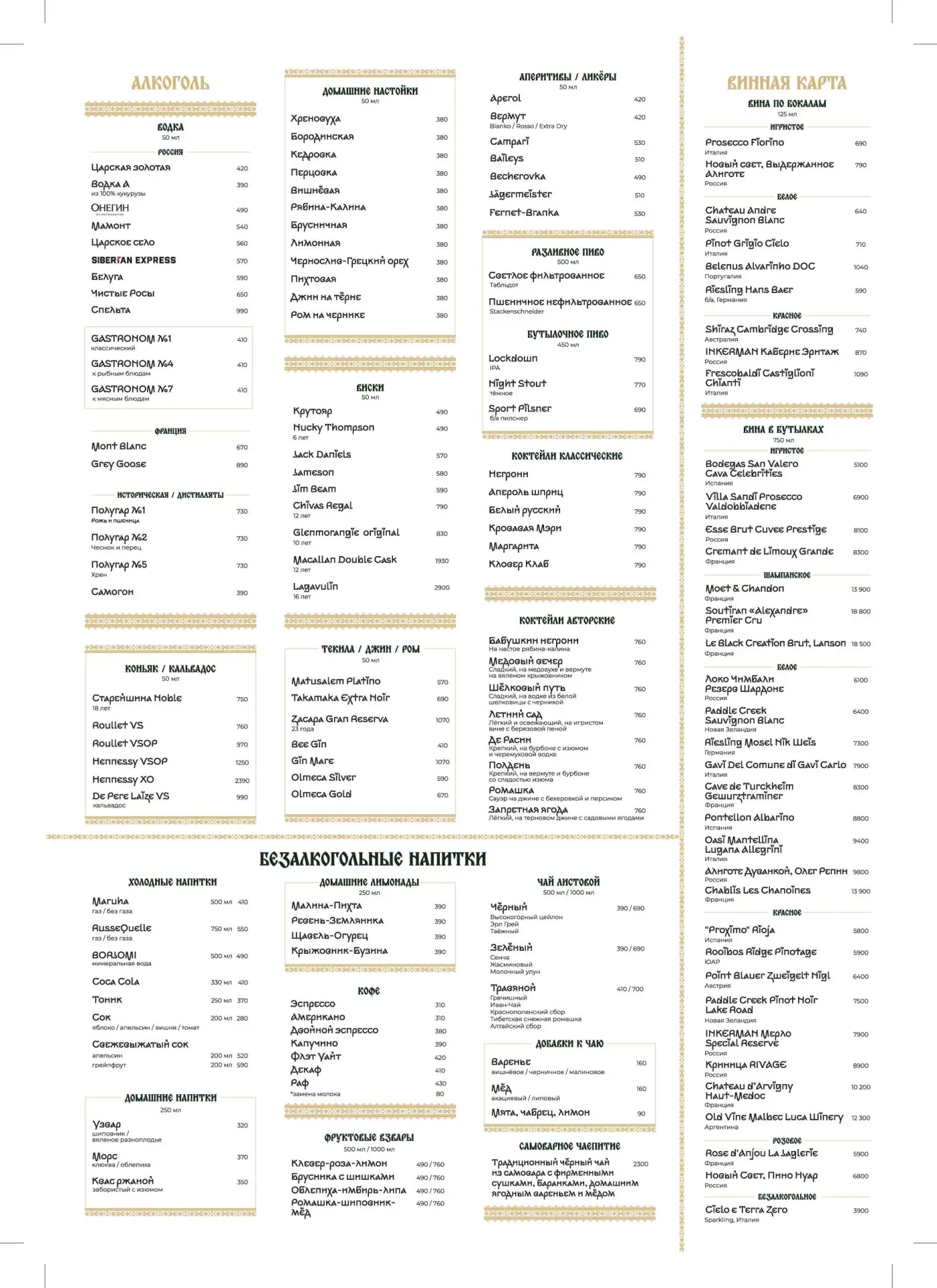 За кухню отвечает шеф Николай Олейников — бренд-шеф с более чем 25-летним опытом работы в ведущих ресторанах и отелях Санкт-Петербурга. Участник кулинарных телепроектов и фестивалей, автор ресторанных концепций. Николай создал собственный стиль — душевный, теплый и вдохновляющий. Его кухня основана на уважении к русским гастрономическим традициям, внимании к продукту и искреннем стремлении создавать неповторимый но в то же время знакомый каждому вкус. В меню — блюда русской кухни из разных уголков России: речная и морская рыба, разварное и жареное мясо, пироги и пирожки, пельмени, вареники, а также соленья и разносолы.